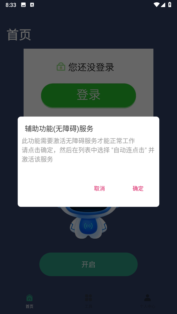 3、进入自动连点击功能,开启使用服务,点击确定后即可启用。