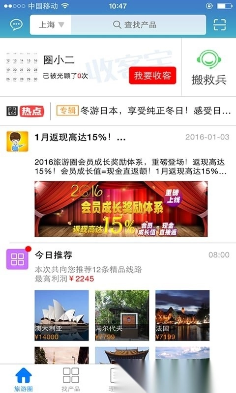 旅游圈收客宝是一款专注于旅游行业的分销工具软件。该平台整合了丰富的旅游资源储备,能够提供具有市场竞争力的团队旅游产品价格。软件了高效的推广功能,帮助使用者在拓展客户的同时提升经营收益。系统还提供充足的潜在客户资源与便捷的客户管理服务,有需要的用户可以直接在本站体验。