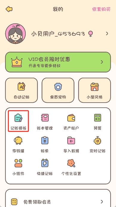 1、打开小贝记账,进入“我的”页面中并点击“记账模板”选项。