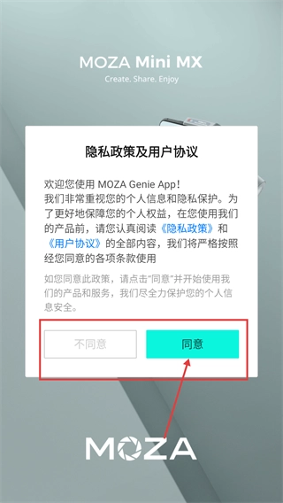 1、使用【MOZA Genie App】前,需阅读【隐私政策】和【用户协议】,点击【同意】按钮,即可进入应用使用相关功能。