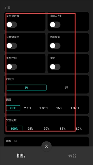 3、进入拍摄设置界面,可对【录制提示音】【音量键录制】等功能开关进行调整,还能设置画幅、安全区域等拍摄参数。
