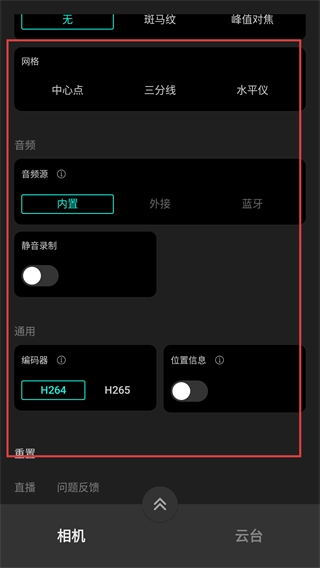 4、在相机设置的扩展界面,可配置【音频源】【编码器】等参数,也能选择网格样式、开启静音录制等功能以优化拍摄体验。
