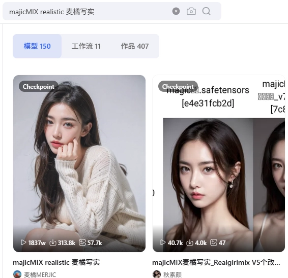 例如,你可以选择“majicMIX realistic 麦橘写实”等模型。