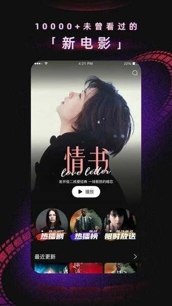 97电影院是一款专注于在线影视资源播放服务的应用,用户能通过它观看海量电影、电视剧、综艺和动漫等内容。这款软件有着简洁直观的界面设计,还拥有强大的资源库,支持多种清晰度选择,能满足不同网络环境下的观影需求。此外,它具备智能推荐功能,会依据用户的观看历史和兴趣偏好,推送个性化的影视内容,帮助用户更轻松地找到心仪影片。不管是热门大片,还是冷门佳作,在这里都能找到。