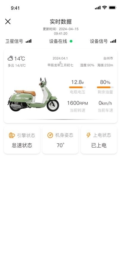 3、可通过App查看车辆的实时运行状态,包括发动机温度、油量、电瓶电压、胎压、转速等信息,并支持异常数据预警提示,帮助骑手提前发现潜在问题。