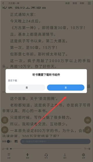 2、点击听书功能会提示你一个听书插件,选择是即可;