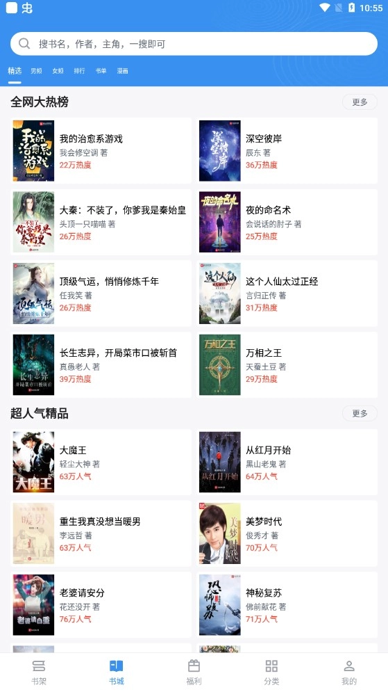 1、进入到9X阅读器最新版后,点击“书城”里面我们可以看到有小说、漫画等。