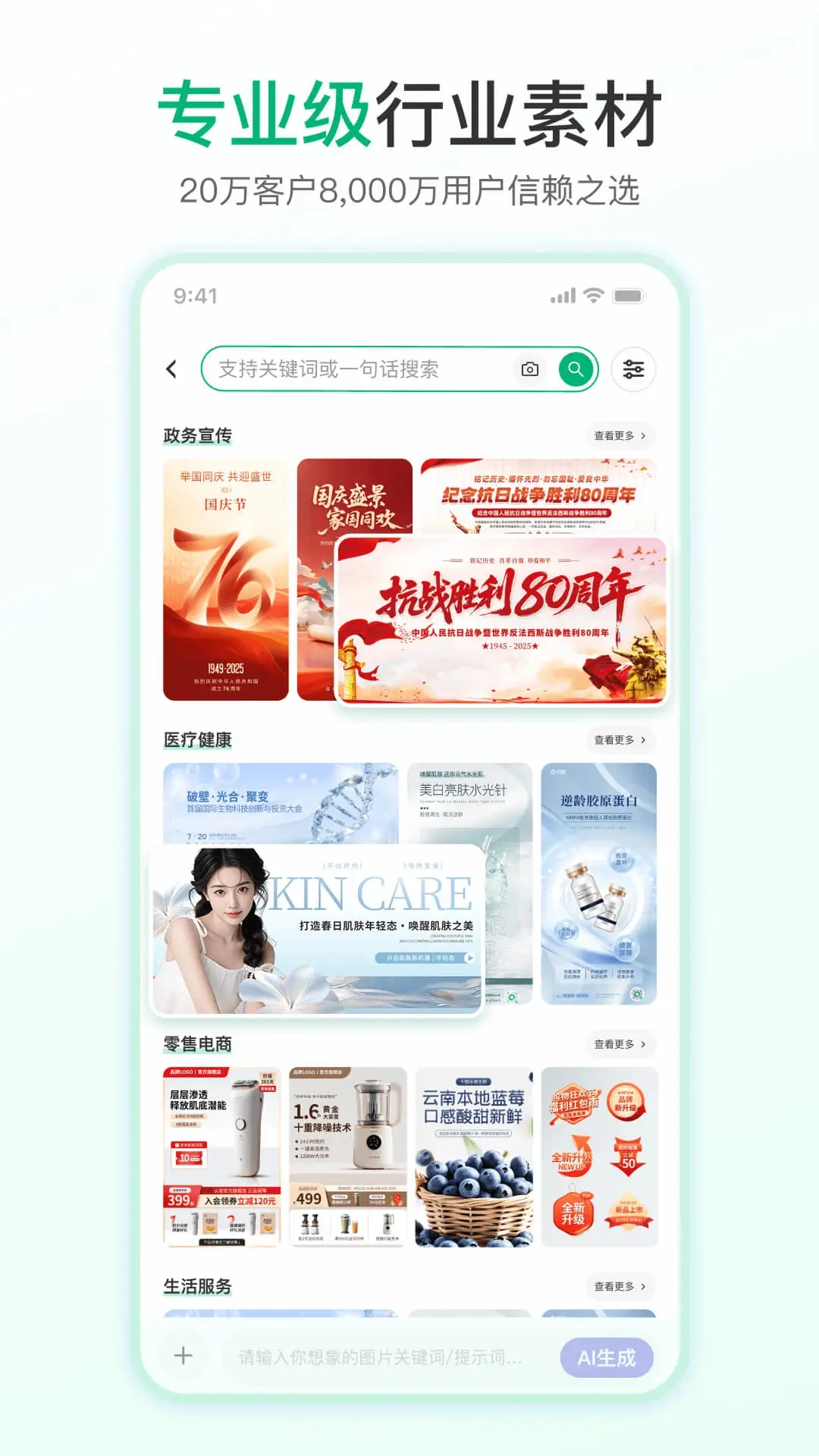 1、企业与商家:数分钟即可完成广告、海报、产品图的制作,且享有商用授权保障。