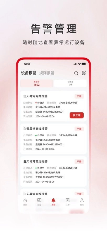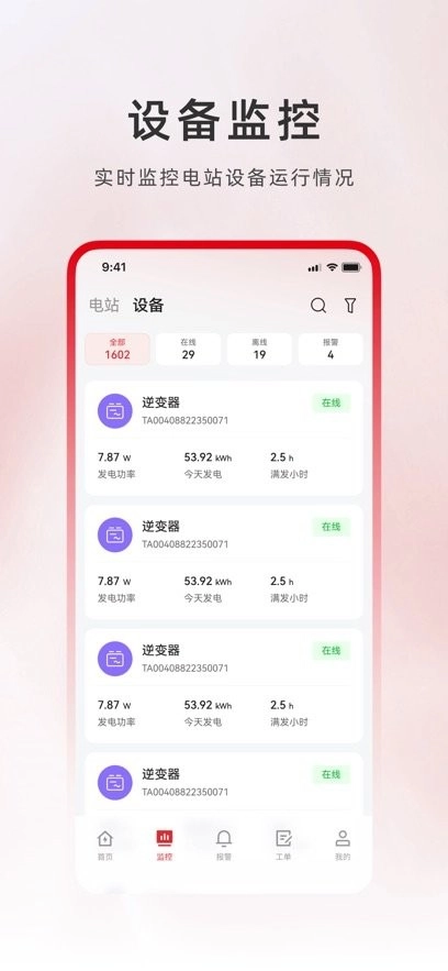 是光伏行业使用的电站监控软件,将电站的各项信息直观展示,让电站的各种信息一览无遗可轻松了解电站情况。将设备异常情况进行报警提醒,用户可以随时查看了解设备故障异常的报警情况。