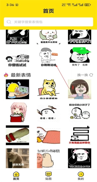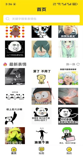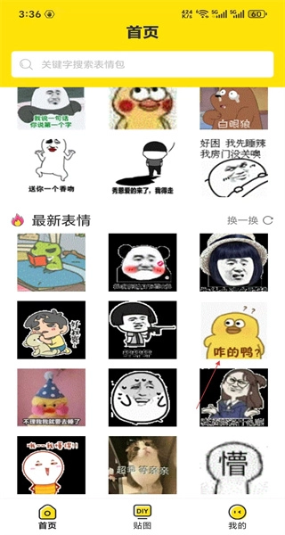 1、进入软件后,首页设搜索栏及表情展示区,最新表情板块含多款内容,选择对应表情,开展浏览操作。