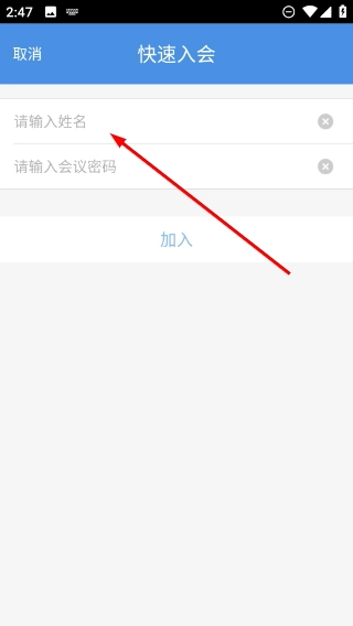 2、在快速入会页面,依次填写参会所需的姓名与会议密码,完成后点击【加入】按钮即可进入对应会议。