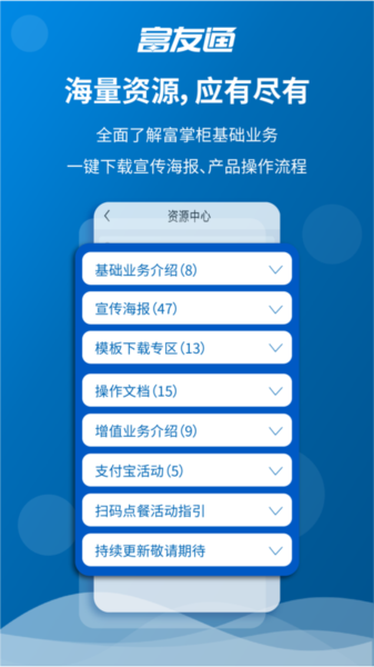 了解富友的基础业务介绍、宣传海报以及产品操作流程等内容。
