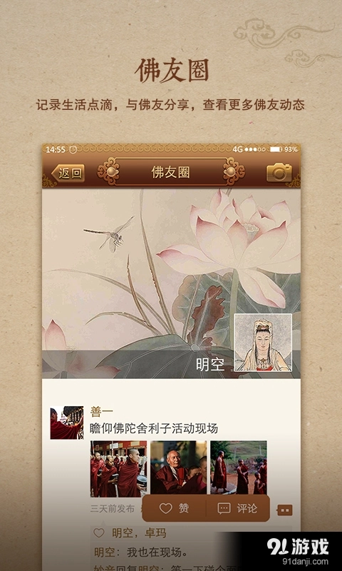 3.社交互动:用户可以关注高僧大德,结善缘共证菩提,还可以与志同道合者一起研习、互相督促,共同追求精神成长。