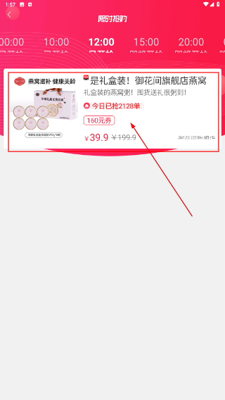 3、进入限时抢购页面后,先确认商品对应的场次时间,再点击目标商品卡片,查看该商品的优惠活动和库存情况。