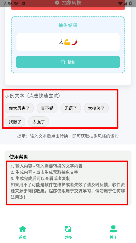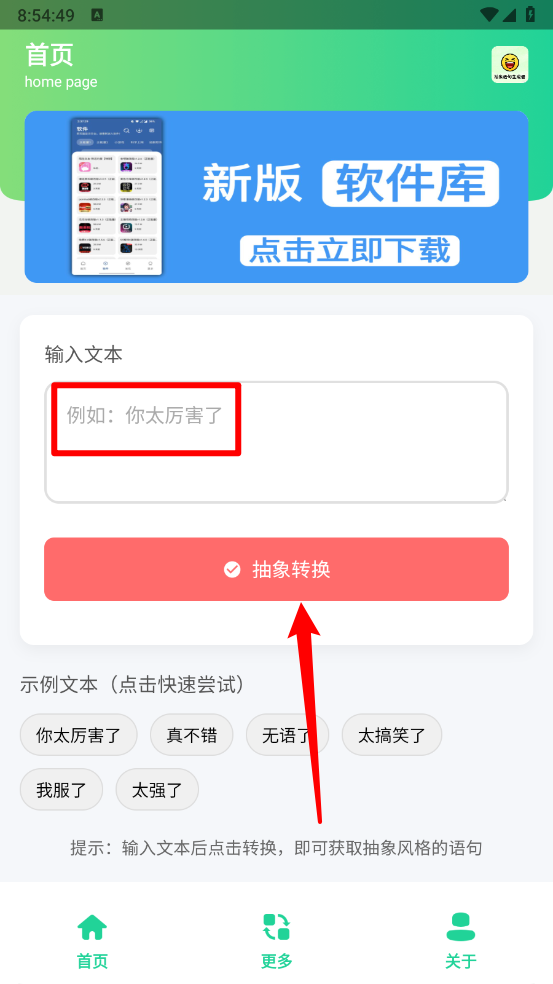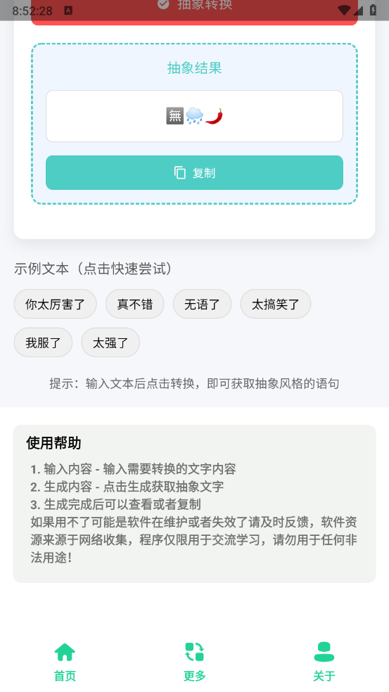 抽象语句生成器是一款免费创意语句生成工具,只需输入普通文字,就能立刻转换成各种出人意料的网络热梗与抽象表达,支持一键复制使用,让日常交流惊喜满满。不管是想逗乐朋友,还是制造聊天话题,这款工具都能为你带来源源不断的欢乐。