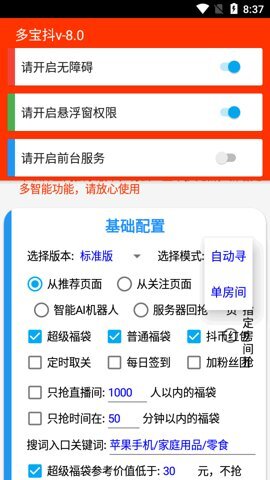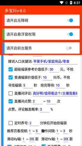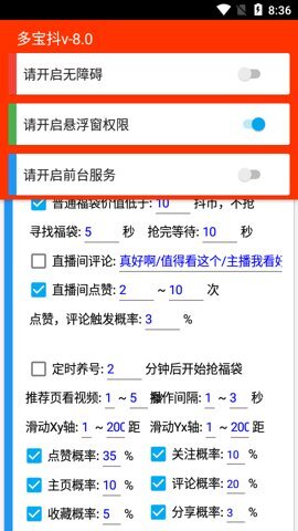1. 启动多宝抖应用,进入其主界面; 2. 进入顶部的权限设置页面,将所有权限开启。