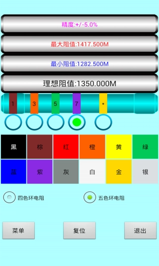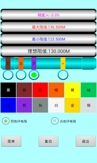 色环电阻计算器是一款专业的电阻计算软件,色环电阻计算器内存小,功能强大,用户可以在色环电阻计算器手机版轻松计算电阻值。这款软件帮助更多的喜欢学物理的朋友,去计算色环电阻的识别的计算,还有支持了四色环和五色环的店租的识别与计算,就让更多喜欢物理的朋友,都能通过软件就能计算电阻,非常方便的一款电阻计算器!