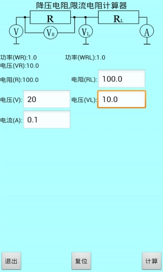 2、解压限流电阻,用户可以根据自己的需求输入数据,轻松就能计算电阻的数据,并且含有复位功能,用户可以将计算的数据进行复位,即可重新计算;