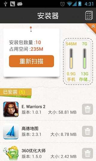 2. 操作极其简单。仅需打开软件,就能扫描手机里的安装包。