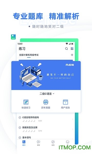 计算机二级题库 这里收录了历年考试中出现频率最高的题型,同学们可以在线多加练习,这对提高考试通过率很有帮助!它堪称计算机考试的通关利器,和线下报班学习相比,这款软件不仅能帮你节省时间,还能让你快速掌握考试要点、顺利通过考试!欢迎大家来到IT猫扑!