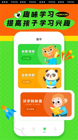 它不仅包含了基础的语文知识,像笔顺、字母发音、汉字拼音等,还借助互动游戏和趣味练习,助力孩子们强化所学内容。凭借其创新的教学理念和多样的互动内容,为孩子们打造了一个安全、好玩的学习平台,是家长和孩子在启蒙教育时期的绝佳之选。