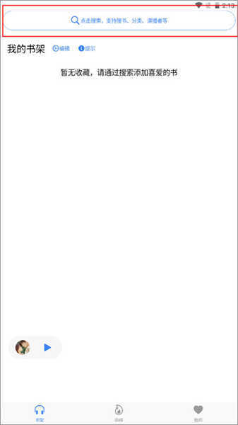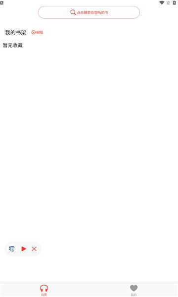 1、打开鲨鱼听书后,会默认进入【书架】页面,您能在搜索框里输入关键词来查找自己感兴趣的小说。