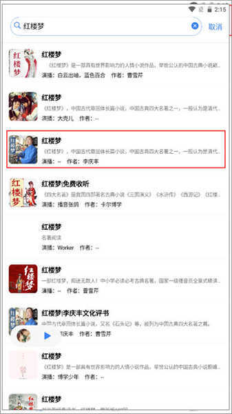 2、输入关键词后,下方会呈现与之相关的书籍音频内容,点击其中任意一本就能进入播放界面。