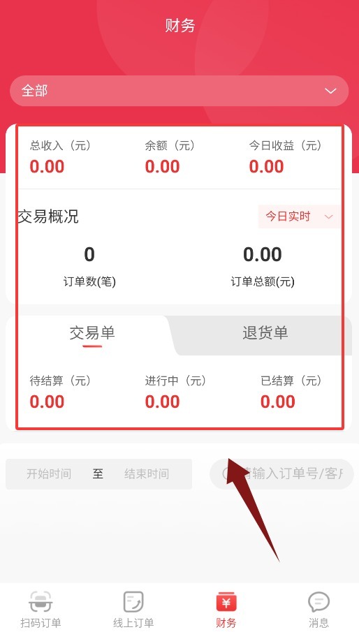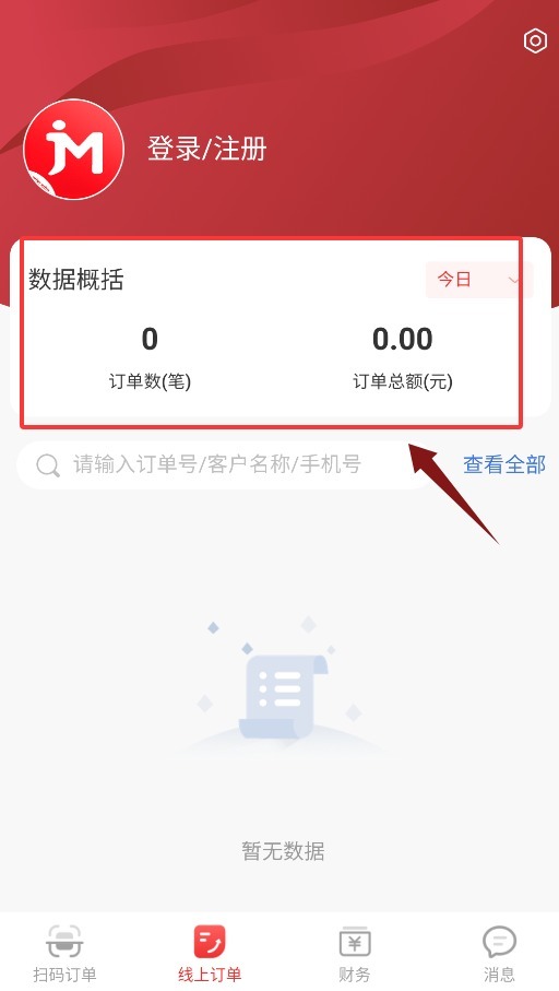 2、在扫码订单界面中,能够查看数据概况、订单数量以及订单总额。