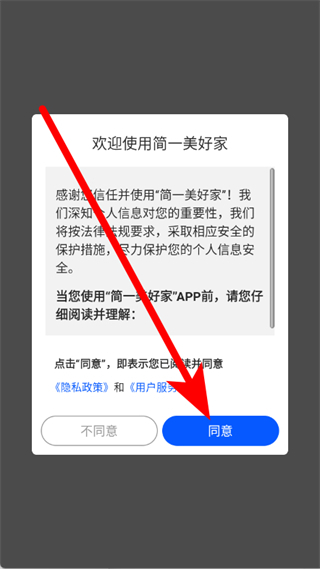 1、打开简一美好家,在隐私协议弹窗中,点击同意。