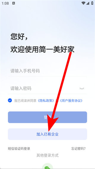 2、在登录页面,点击加入已有企业,进入页面。