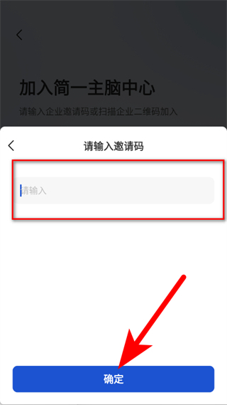 4、进入邀请码输入页面后,填写企业邀请码并点击确定按钮,即可完成加入企业的操作。
