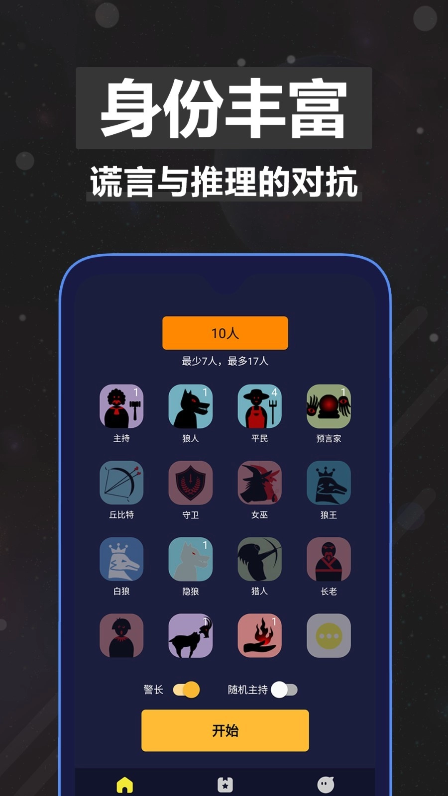 内设16种角色,包括:法官、平民、狼人、预言家、丘比特、守卫、女巫、狼王、白狼、隐狼、猎人、长老、白痴、替罪羊、乌鸦和警长。
