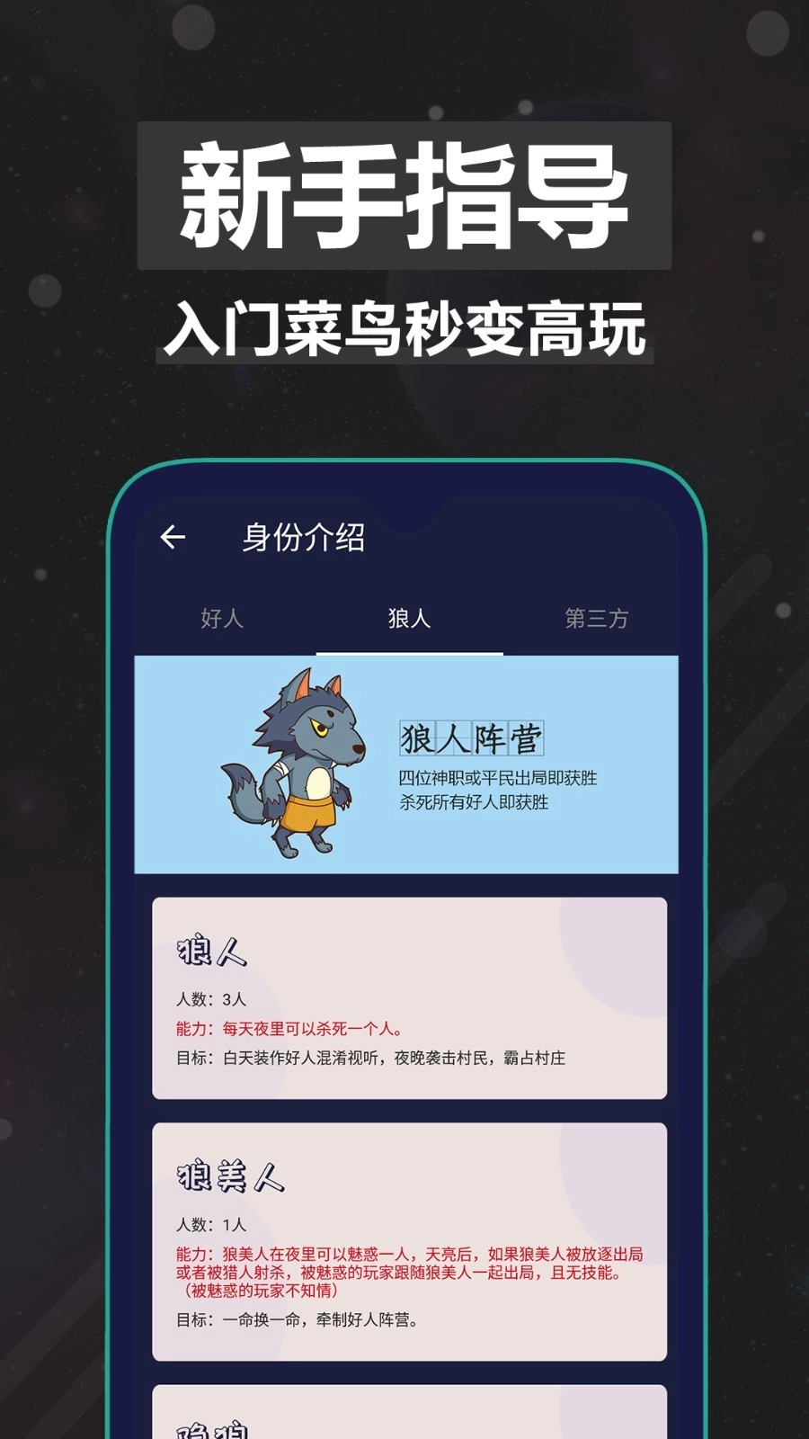 1、这是一款狼人杀助手,支持单机分发身份,就算没有实体卡牌也能轻松开局!