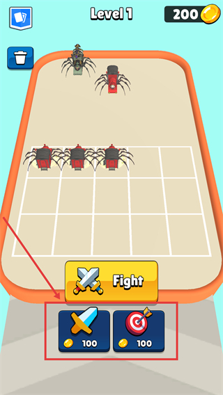 3、消耗【100-金币】解锁【剑】或【飞镖】道具,待单位能力得到增强后,点击【Fight】即可进入对战环节。