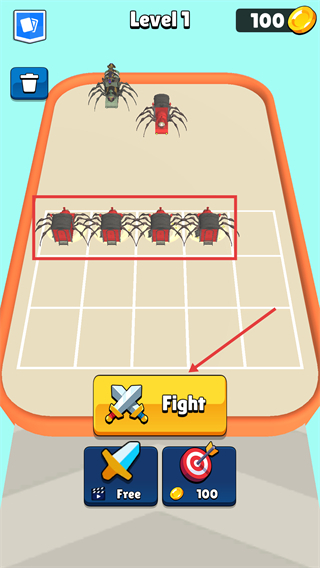 4、通过合并的方式增加蜘蛛单位的数量,确定好阵容后点击【Fight】按钮开启战斗,以此推进关卡的进度。