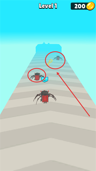 2、在移动时靠近其他蜘蛛单位,收集【钥匙】道具,并且合并相同单位来增强战力。
