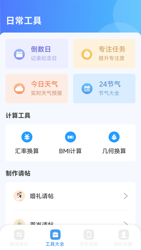 2、倒数日、专注任务、天气报告、二十四节气等实用工具,能够满足用户在日常使用过程中的多样化需求。