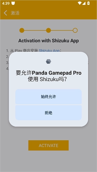 软件(关于Shizuku的启动很简单,参考其操作即可),然后使用Shizuku进行激活,激活方式十分简单就是打开Panda Gamepad Pro后点击【需要激活】