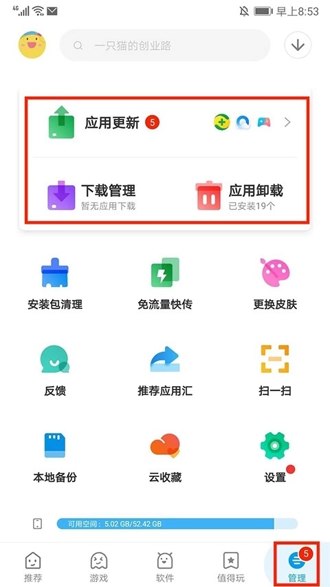 1、启动应用汇旧版本,进入应用主界面后,底部设有推荐、游戏、软件、值得玩和管理等分类板块。用户既能依据自身需求,在相应分类中查找所需的应用或游戏,也可借助顶部的搜索框输入关键词来精准搜索。