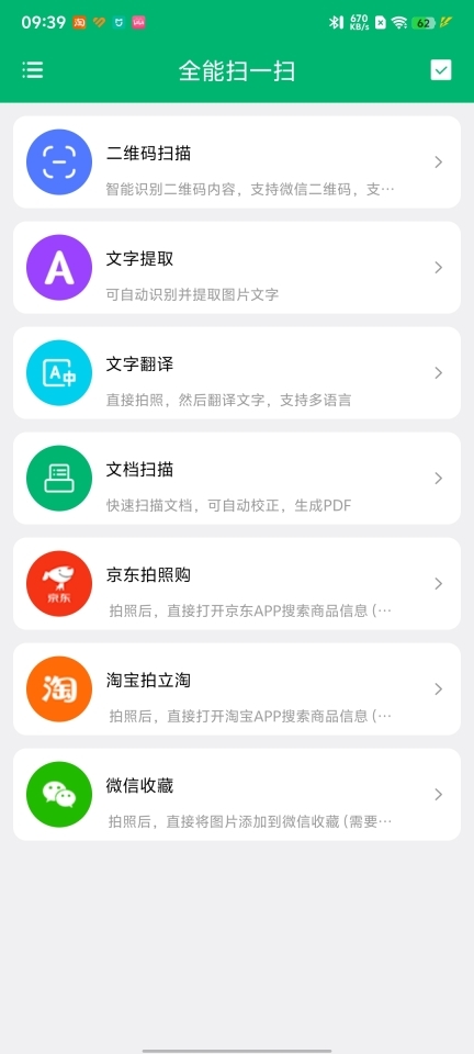 这是一款扫描工具类应用,当前具备以下功能:扫描文档并自动校正、离线识别二维码、扫描图片提取文字、扫描文字自动翻译、拍照识别商品信息以及拍照添加至微信等。此外,该软件支持个性化显示设置,用户能够自主将常用功能配置到首页。