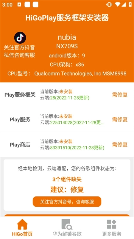 1、软件安装完成后打开,进入首页就能看到自身的手机信息,同时会发现设备服务、商店、服务框架这三项工具均未安装,需要进行修复