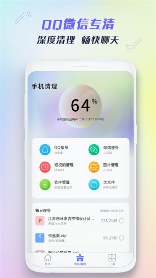 给手机做QQ或微信的瘦身清理吧!这里能专门清理短视频、图片和大文件,深度扫净手机里的各类垃圾,帮你的手机彻底释放大内存空间,让你畅快聊天不再是奢望!