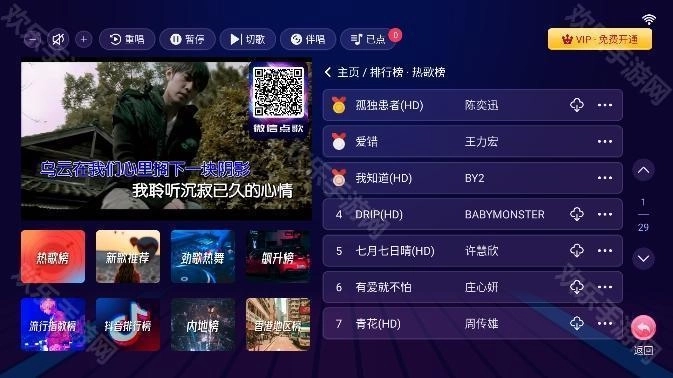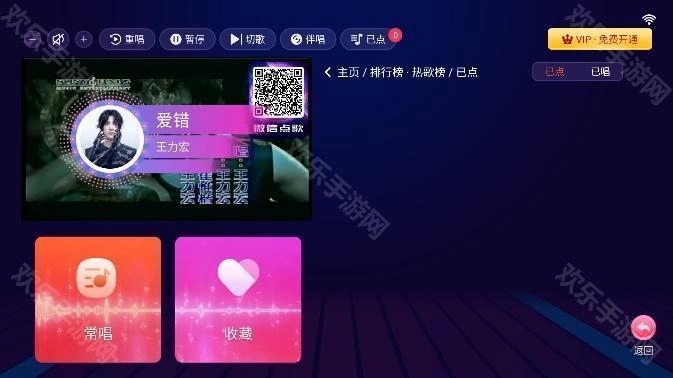 6、播放管理功能:支持暂停播放、切换歌曲、重新演唱,能够调整伴唱与原唱的模式,还可以查看歌词的进度情况。