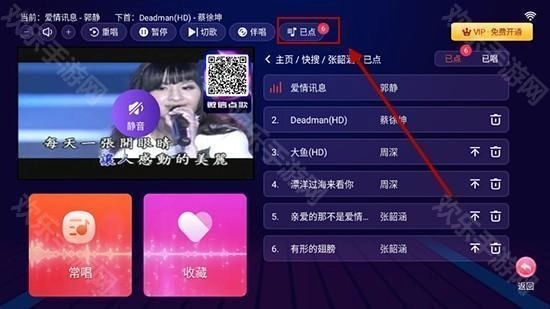 2、在“已点”列表里点击对应的歌曲,就能进入演唱界面;该界面默认是伴唱模式,不过你可以根据需要切换到原唱模式。