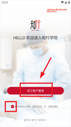 在本站安装并打开强生知行应用,进入登录界面后,勾选登录即表示您已同意《服务协议》与《隐私政策》,随后点击员工账户登录按钮即可。