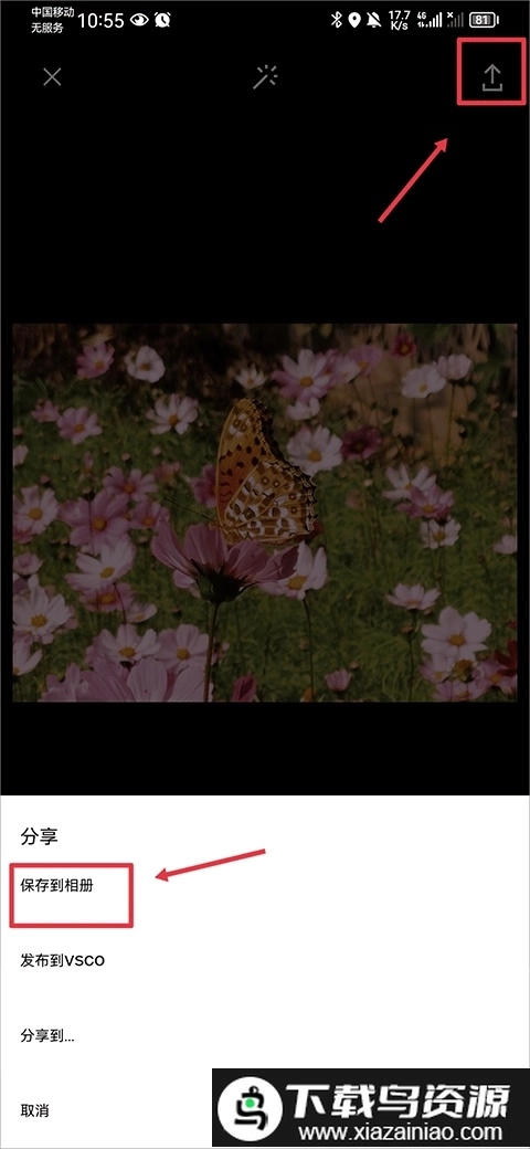 7. 叠加操作完成后,点击右上角的导出按钮,选择“保存至设备相册”选项就可以了。