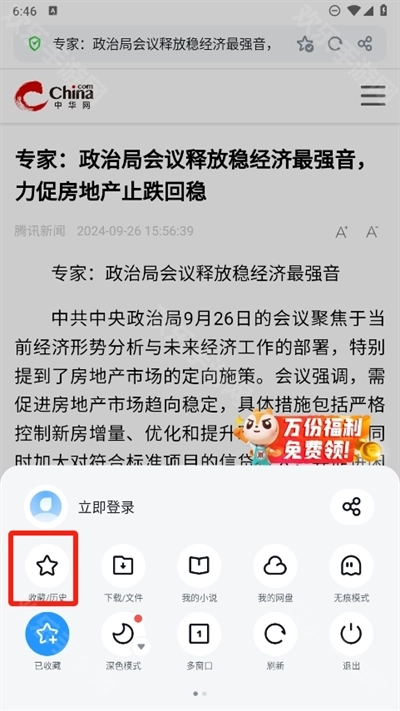 2、点击小星星的位置,出现√即表示收藏书签成功,之后在最下方找到中间的图标并点击进入。