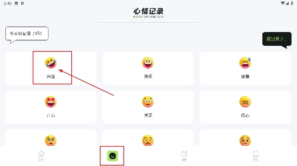 3、在心情记录页面,挑选对应的情绪标签(例如“兴奋”),接着点击确认按钮,即可进入记录补充环节。