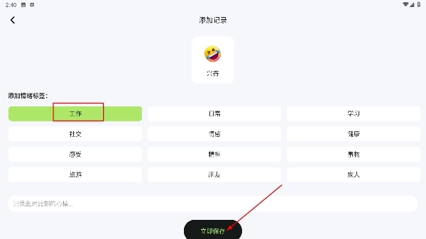 4、进入添加记录页面,选择“工作”等场景标签,补充相关内容后点击“立即保存”按钮,即可完成心情记录的操作。