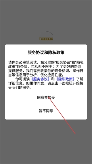 1、启动【TIDEBOX】应用后,仔细阅读【服务协议】与【隐私政策】,在确认同意相关条款内容后,点击【同意并接受】按钮,即可进入下一步操作流程。